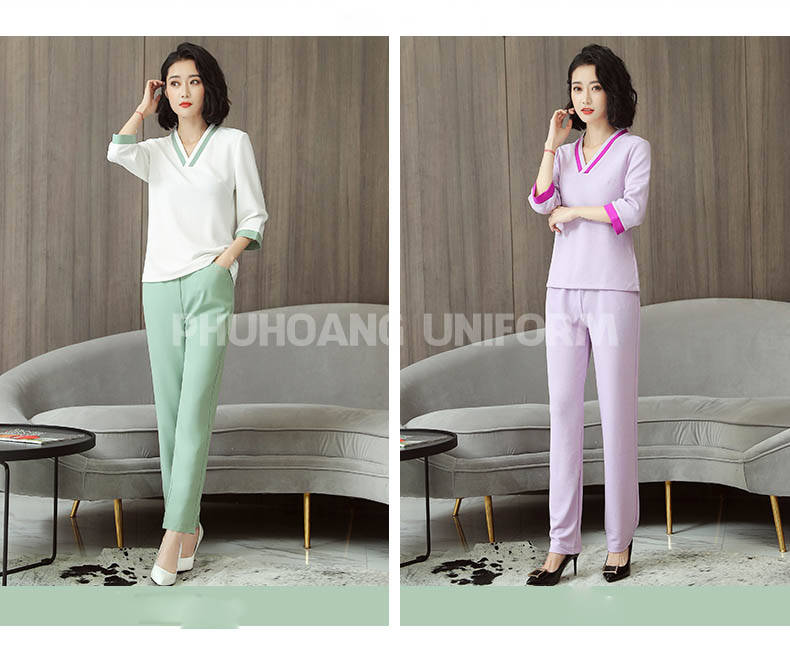 Một mẫu đồng phục spa may sẵn khác với cổ V tay lửng, form suông tạo sự rộng rãi thoải mái cho người mặc, cùng quần tây sáng màu lưng thun đơn giản.