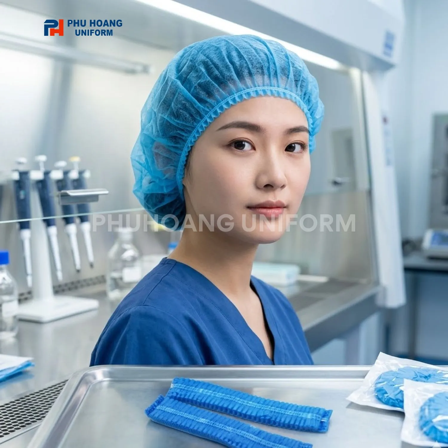 Tóc rụng là một mối nguy cơ lây nhiễm chéo rất lớn trong phòng mổ. Chiếc mũ nilon này sẽ trùm kín toàn bộ mái tóc của bạn vào trong. Không một sợi tóc nào có thể vô tình rơi rớt ra ngoài không gian.
