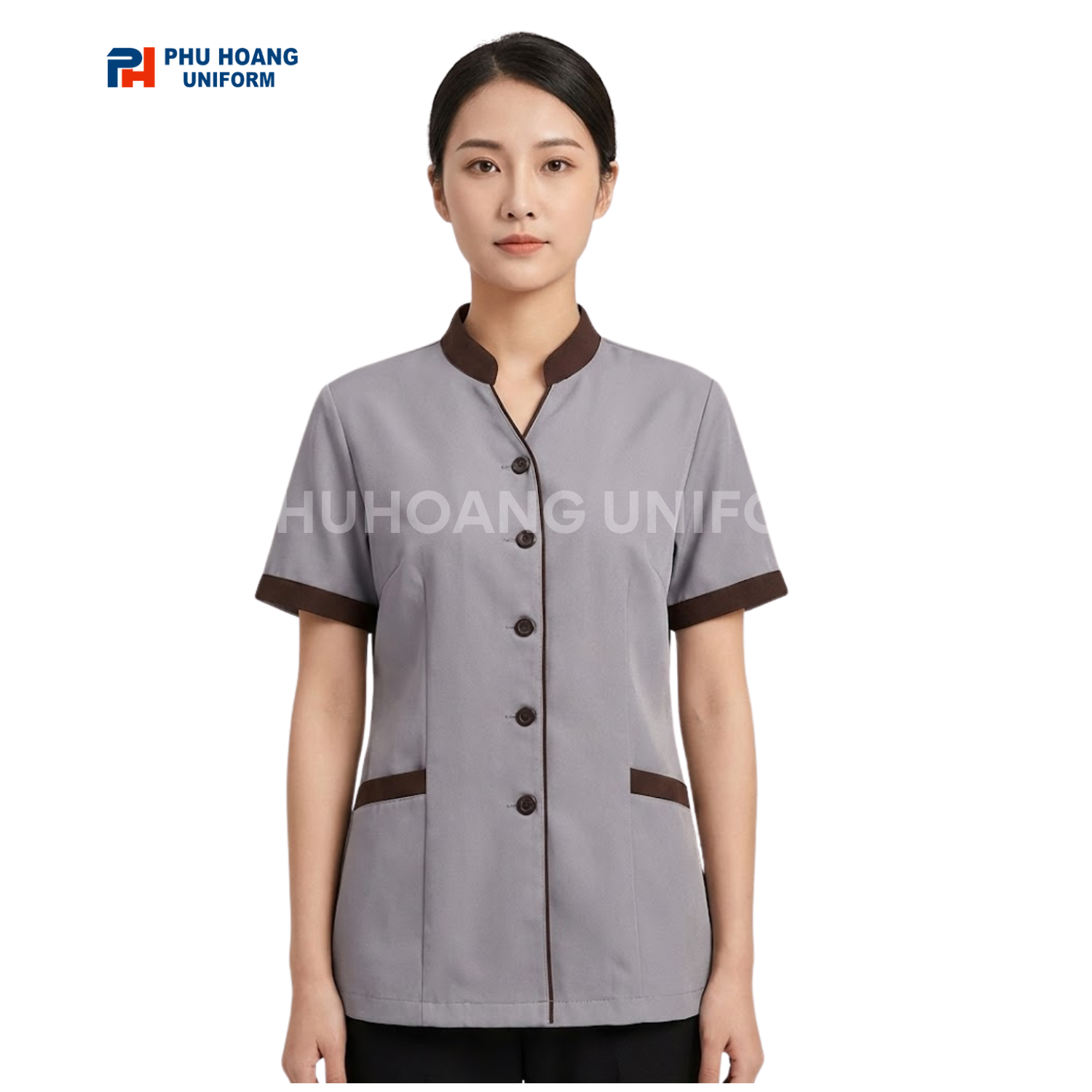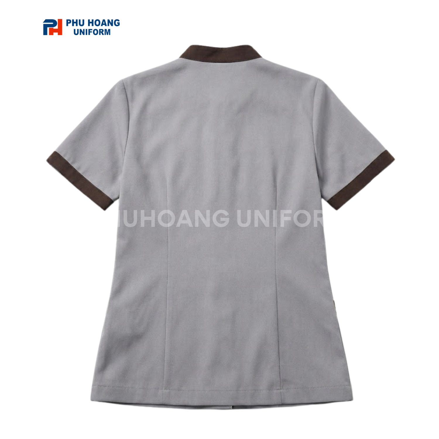 Mẫu áo tạp vụ xám phối viền nâu của Phú Hoàng là giải pháp hoàn hảo. Nó cân bằng giữa tính thẩm mỹ và công năng sử dụng.