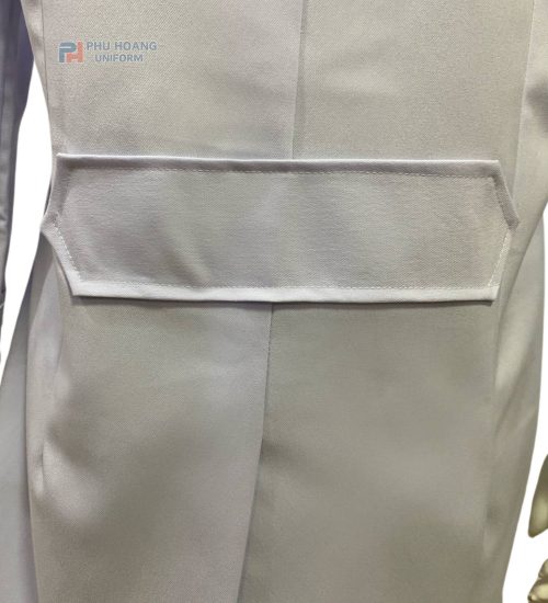 Phía sau lưng áo có dây đai và xẻ tà, không chỉ giúp điều chỉnh độ rộng để vừa vặn hơn với vòng eo mà còn tạo sự thoải mái, dễ dàng di chuyển khi làm việc.
