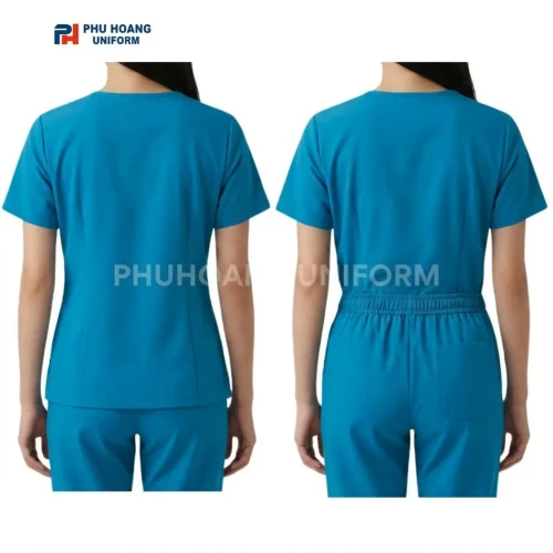 Đặc điểm: Bề mặt vải chống bám bẩn tốt và không hề bị xù lông. Thiết kế cổ chữ V thanh thoát tôn lên vùng cổ. Hệ thống túi áo vô cùng tiện lợi cho công việc. Độ co giãn tốt giúp nhân viên thoải mái di chuyển.