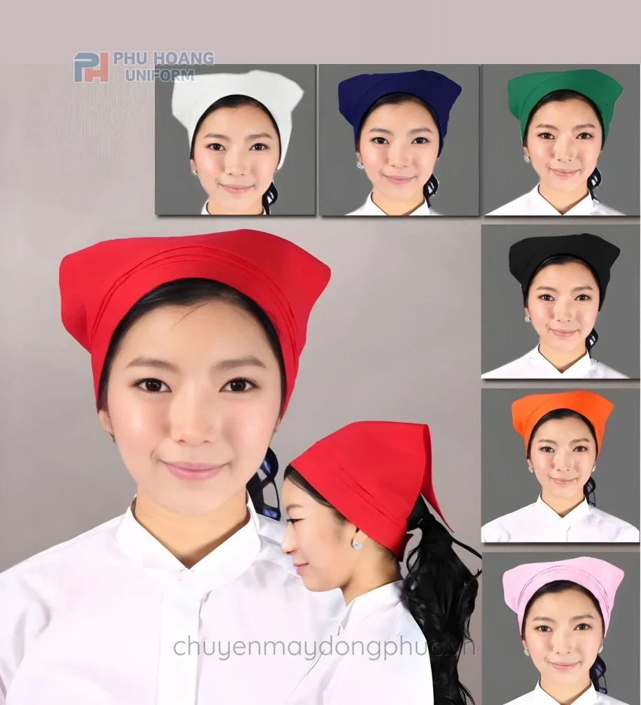 Xưởng đồng phục Phú Hoàng chuyên thiết kế và sản xuất nón đầu bếp tam giác, nón bếp Nhật, nón khăn trùm và các mẫu đồng phục bếp hiện đại.