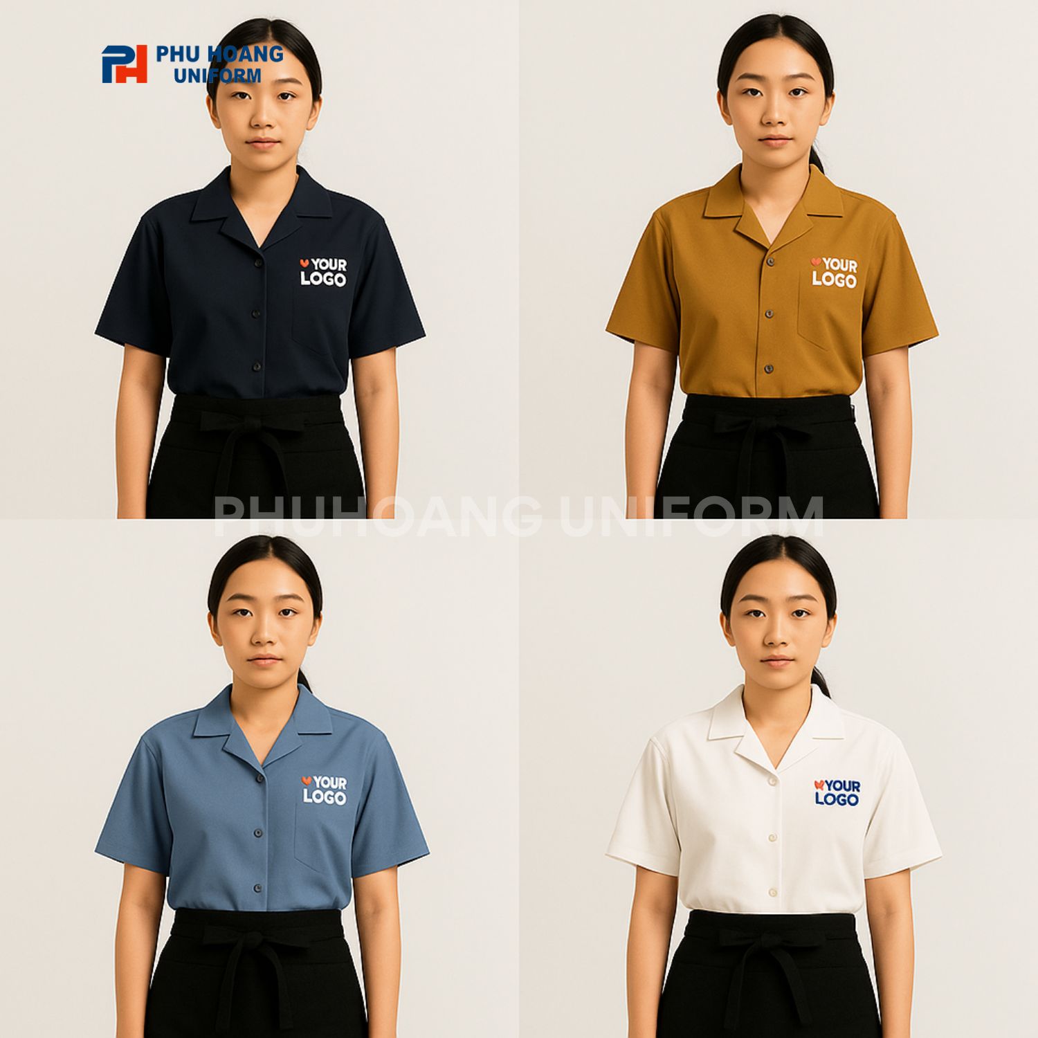 Đặc điểm: Đường may tỉ mỉ, phom áo đứng đẹp, dễ kết hợp với tạp dề hoặc quần tây đồng bộ. Phù hợp cho nhà hàng, khách sạn, quán cà phê, spa, resort…