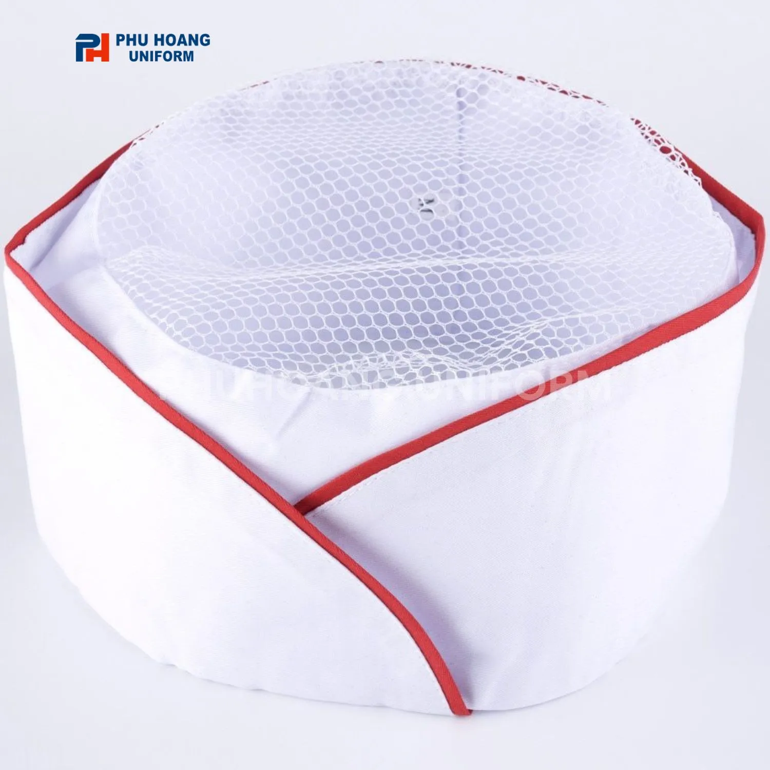 Thiết kế này không chỉ đẹp mắt mà còn giúp nón đứng form, cứng cáp hơn. Đường viền thường được phối màu tương phản (ví dụ: nón đen viền đỏ, nón trắng viền đỏ…). Tạo nên sự nổi bật, thu hút ánh nhìn của thực khách, đặc biệt là trong các nhà hàng có không gian bếp mở.